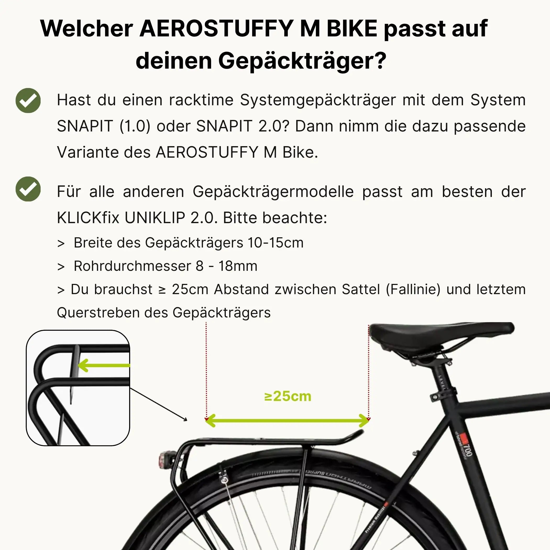 Der AEROSTUFFY M BIKE mit passendem Adapter macht dein Radfahren spürbar komfortabler – beim Einkaufen, Pendeln oder Ausflug. Die ultraleichte Box schützt und isoliert zuverlässig bei Hitze, Kälte, Regen oder UV-Strahlung. Alles bleibt sicher, sauber und unversehrt verstaut – kein zerdrücktes Obst, keine angetaute Tiefkühlware, kein lauwarmes Bier.